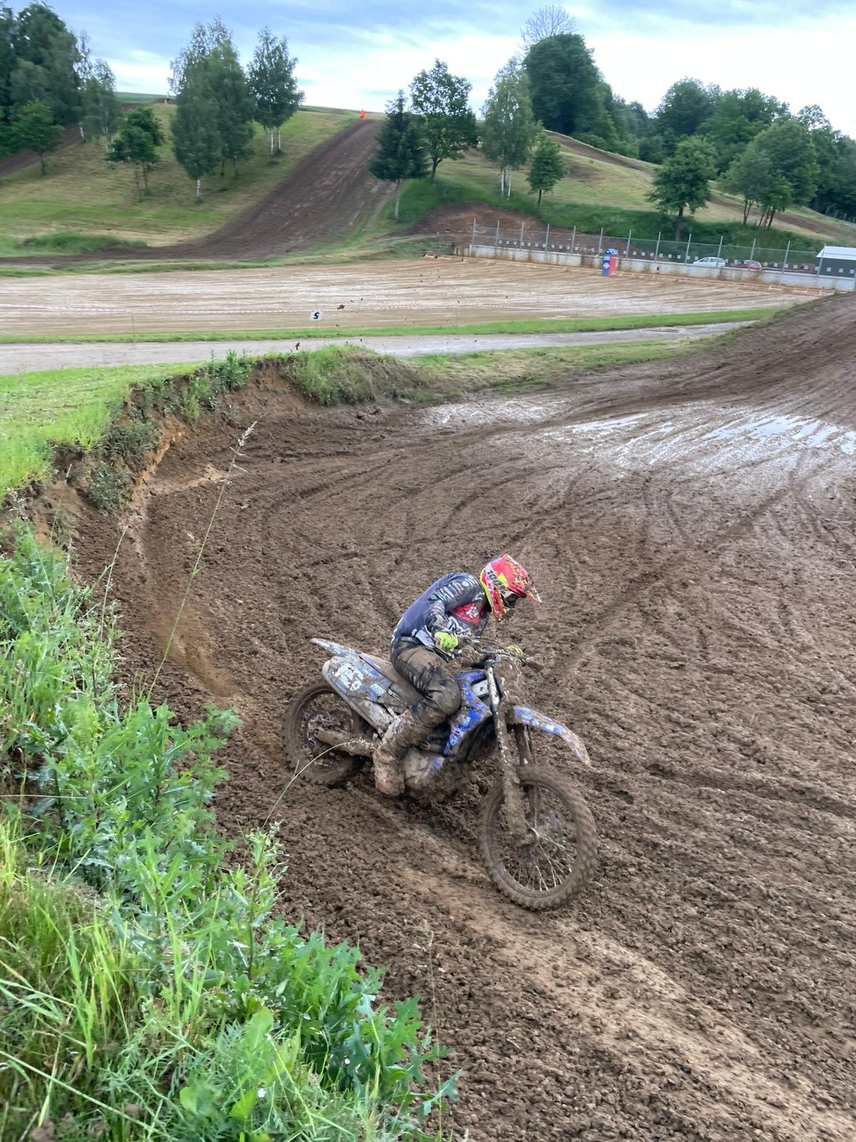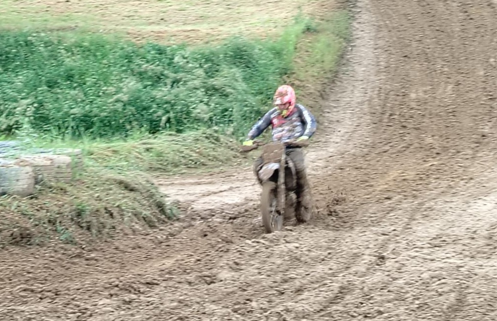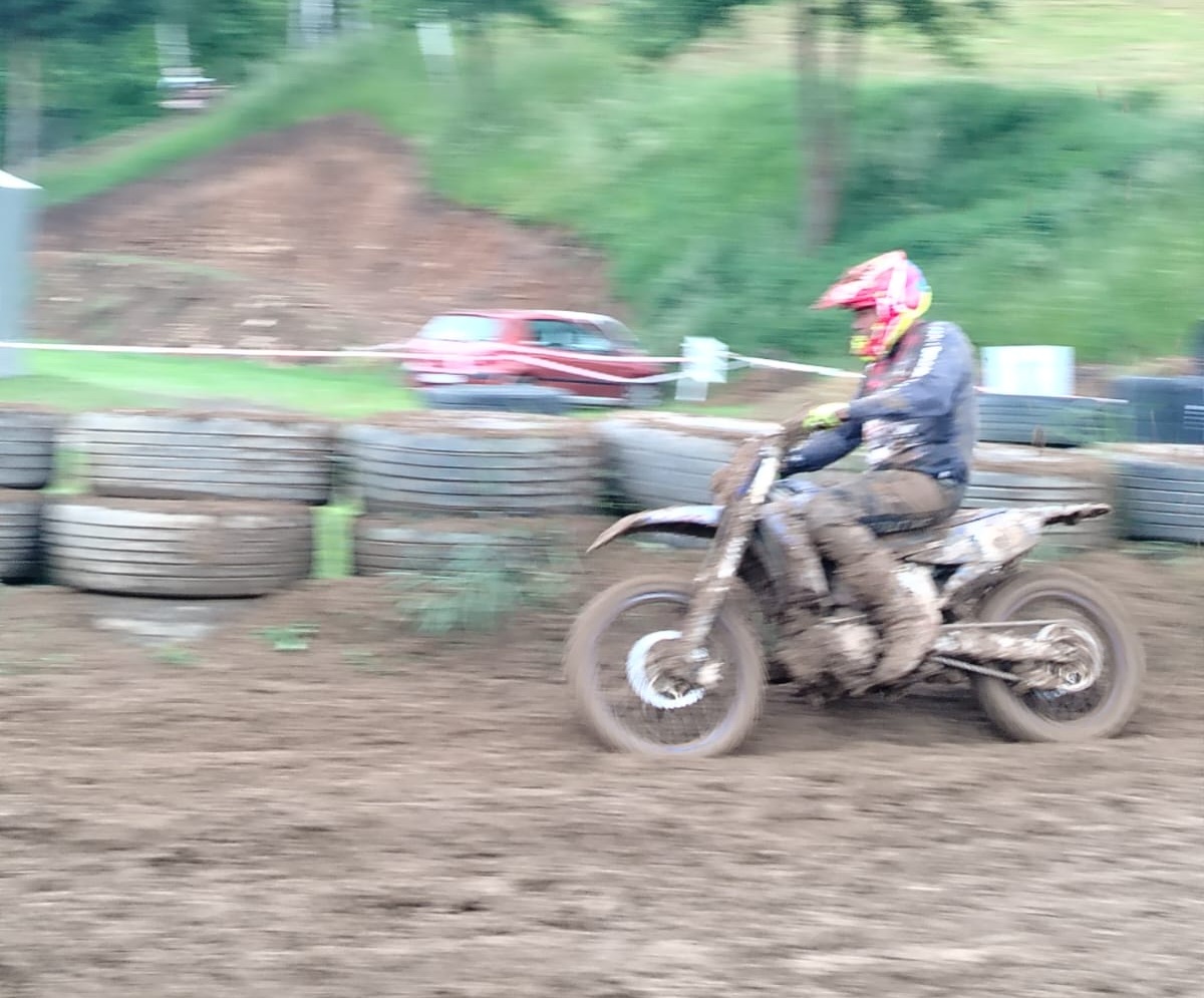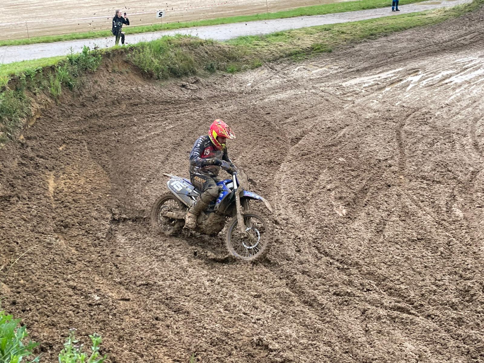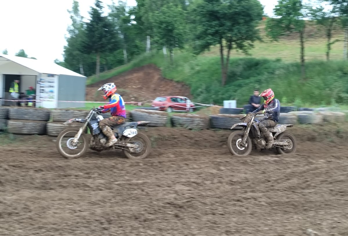 Start do druhé jízdy byl stejný, zase 5. místo. Dva pády Pavla Křížka na čele mě dostaly na 4. místo, pak jsem vlastní hloupou chybou spadl a opět se propadl asi na 14. Místo. Tentokrát se mi moc vstávat nechtělo, byla to rána a k tomu se mi to stalo pod kopcem. No, sebral jsem sebe a motorku očistil si rukavice a vyjel na stíhací jízdu. Trať byla hluboká a těžká, ale dal jsem do toho vše a dost si zapředjížděl. Musel jsem po pádu ještě zastavit a srovnat řídítka. V cíli hodně těžkého závodu 5. místo.