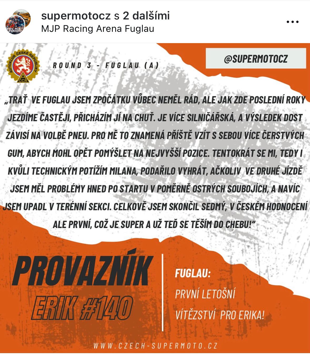 Musím uznat, že šlo o opravdu vydařené závody. Trať ve Fuglau jsem sice zpočátku vůbec neměl rád, ale jak zde poslední roky jezdíme častěji, přicházím jí na chuť. Je více silničářská, a výsledek dost závisí na volbě pneu. Pro mě to znamená příště vzít s sebou více čerstvých gum, abych mohl opět pomýšlet na nejvyšší pozice.